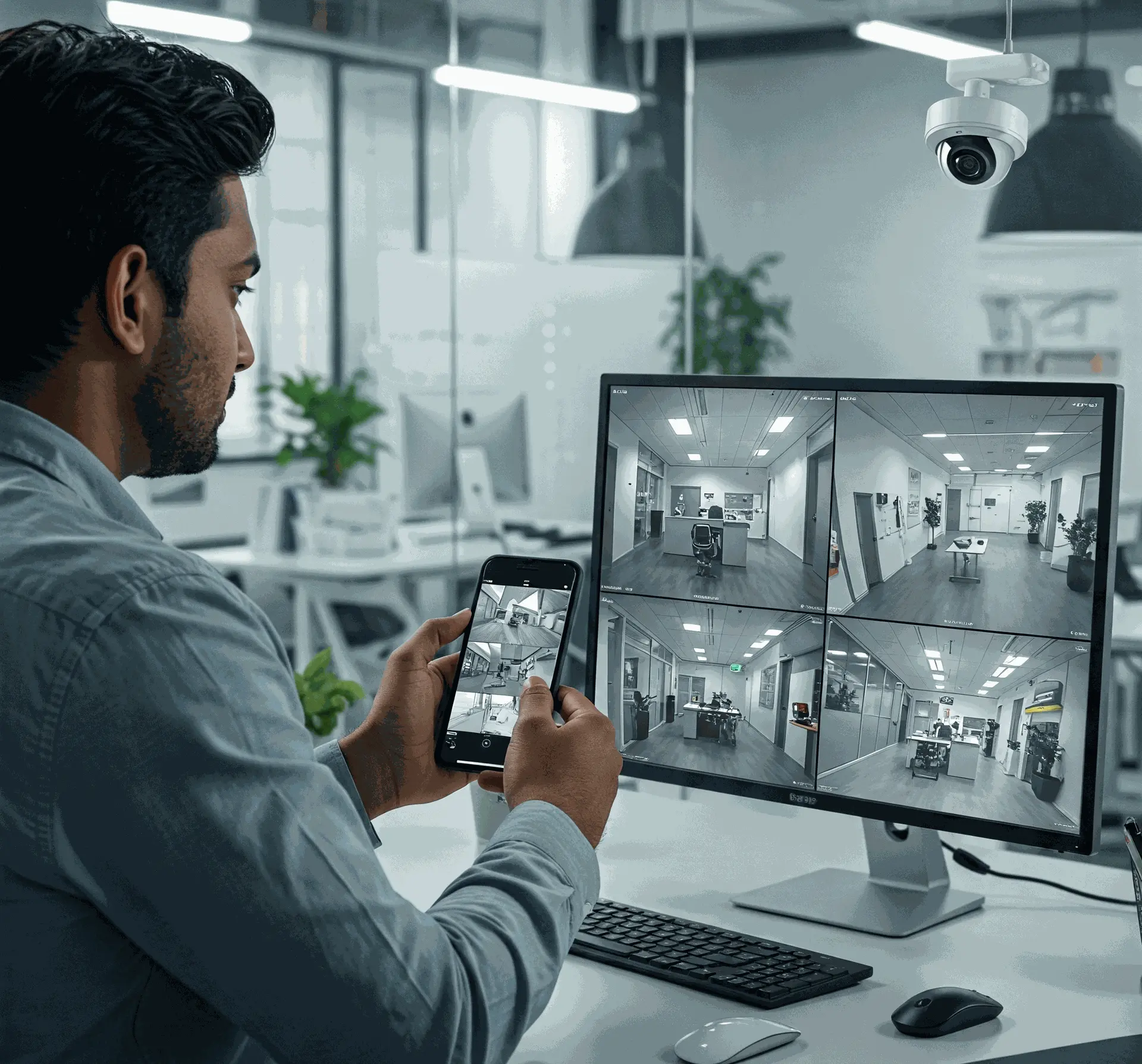 La tranquilidad de saber qué pasa en tu negocio, incluso cuando no estás. Con nuestras soluciones de videovigilancia instalamos cámaras de calidad profesional, con grabación en HD, monitoreo remoto desde tu celular y alertas inteligentes. Ya no dependes de la suerte: ahora tienes visibilidad real.